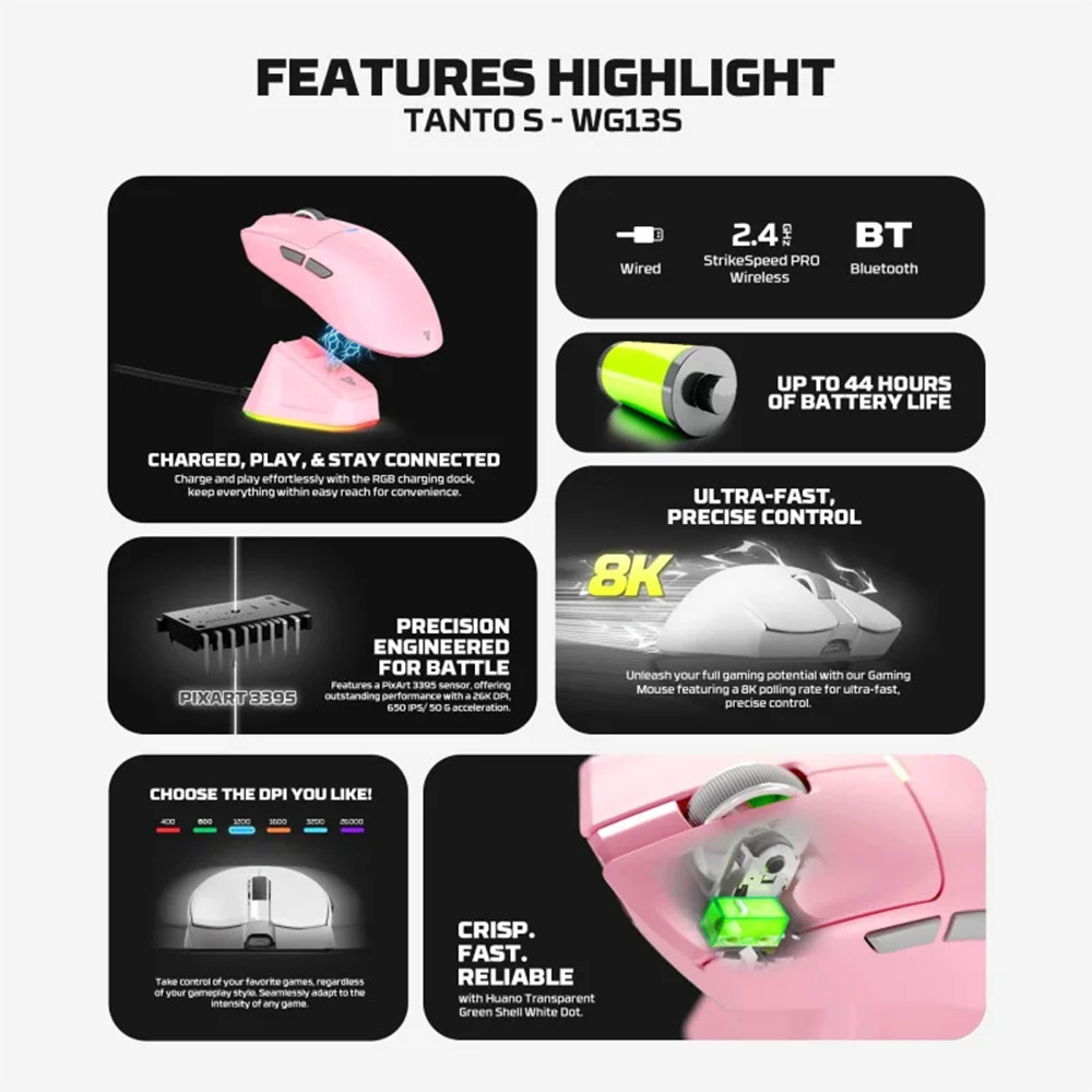 - 26000 DPI, Sensor:PAW3395 PIXART