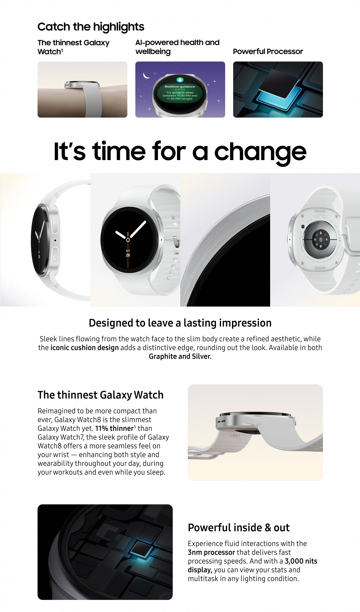 Say hello to the Samsung Galaxy Watch8, the thinnest and most comfortable Galaxy Watch yet, designed to vitalise your daily life through smart fitness routines and wellbeing habits. Whether you’re a casual step counter or an ultra-marathon runner, this smartwatch delivers AI-powered support through Samsung Health and Google Gemini¹, with features tailored to improve your performance, rest and recovery. Add in a lightweight, cushioned design and you’ve got a wearable built for round-the-clock comfort.