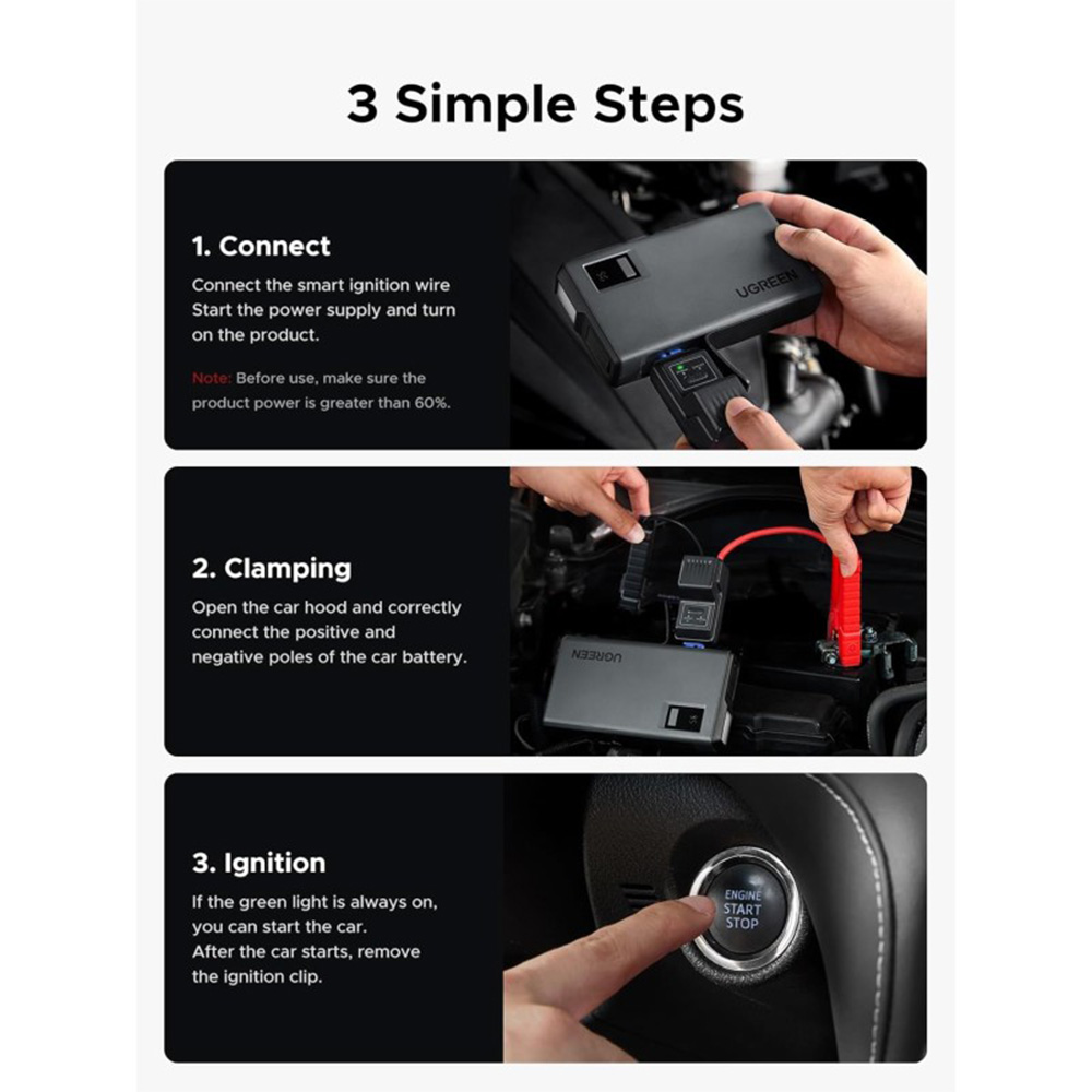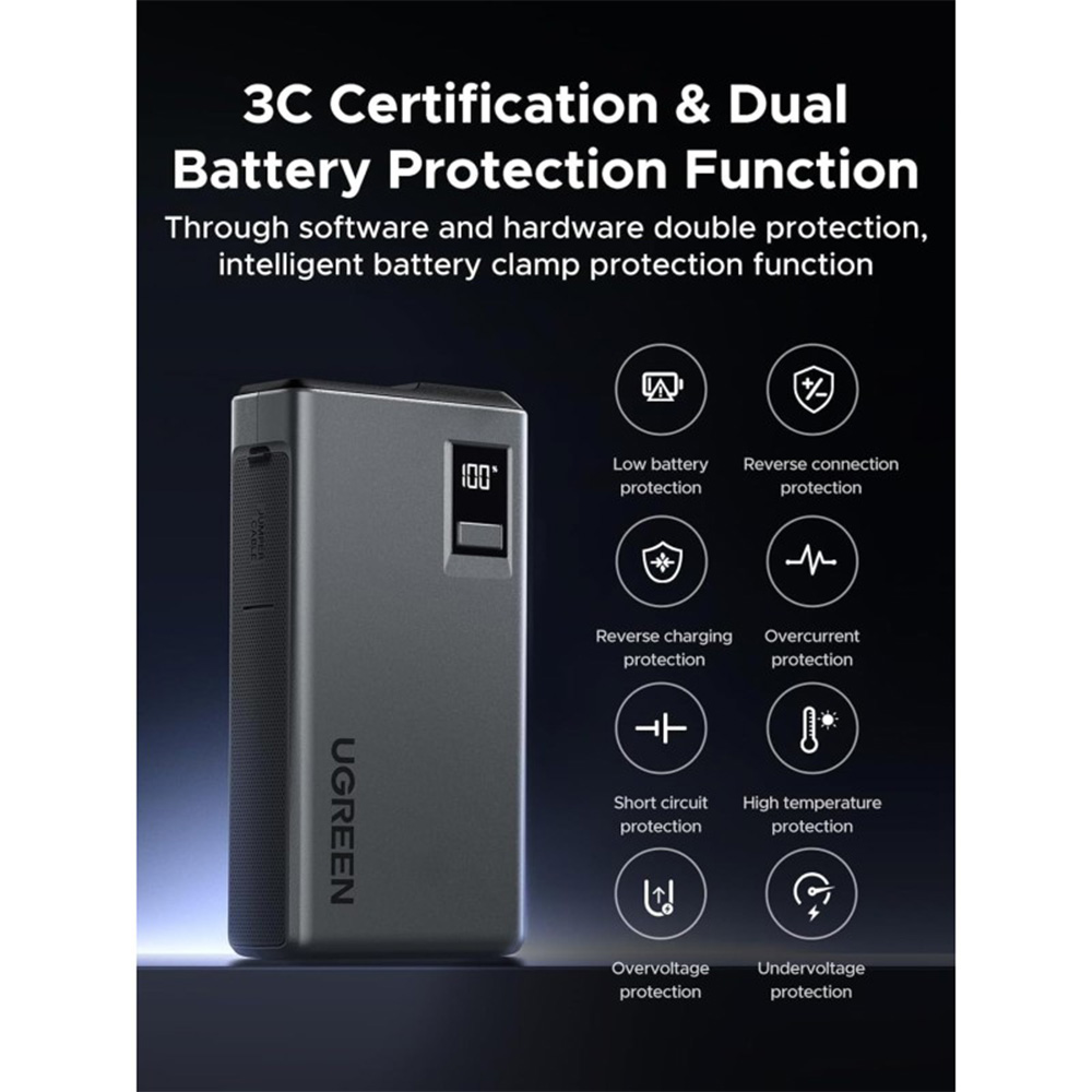 - What’s in the Box: 1 × UGREEN Car Jump Starter + 1 × Jumper Cable + 1 × USB-C Charging Cable + 1 × Storage Bag + 1 × User Manual