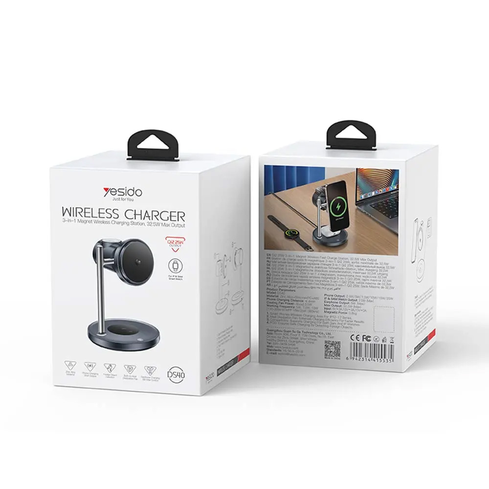 The major asset of the Yesido DS40 lies in its ability to simultaneously manage the power of three essential daily devices. It features dedicated slots for the smartphone (magnetic), wireless earbuds, and connected watch (compatible with “iP” and Samsung models). This is the perfect selling point for customers who want to declutter their environment and never run out of battery on their favorite accessories again.
